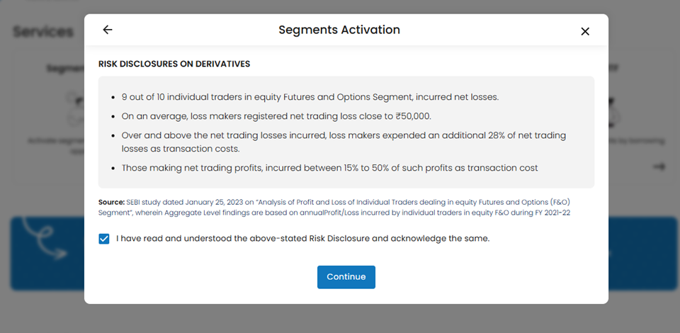 To activate Future & Option Segment you can provide the copy of any one of the following self-attested supporting documents, which is mandatory for the Client opting to trade in Derivatives Segments along with the "Segment Activation Form", which you ...